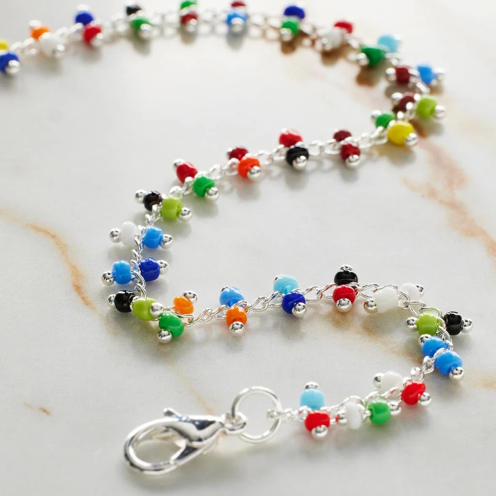Accessorize your outfit by sporting this colorful Bead Gallery glass and metal chain bracelet. Easily secure this pretty bracelet with its lobster clasp. The adjustable chain of the bracelet makes it perfect for every wrist.