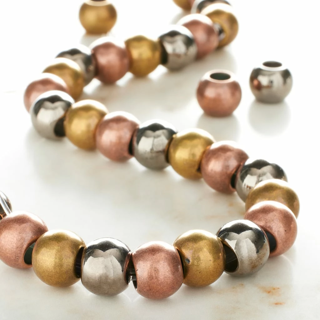 Ideal for all your jewelry making and beading projects, these acrylic beads are plated in three different finishes: copper, gunmetal, and brass. They’ll make the perfect spacers to complete stunning accessories.ย