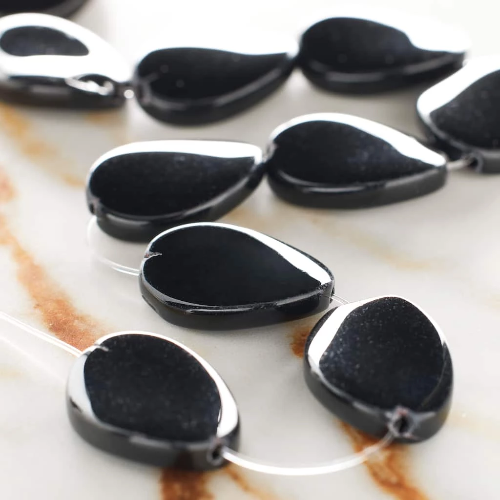 These glass beads are perfect for bringing deep black color and shine to your own jewelry designs. The shiny flat oval glass brings bling factor to any project. They are perfect for use with any cord: stretch cord for easy bracelets, nylon cord for beginner jewelry designs or tigertail for more advanced projects.