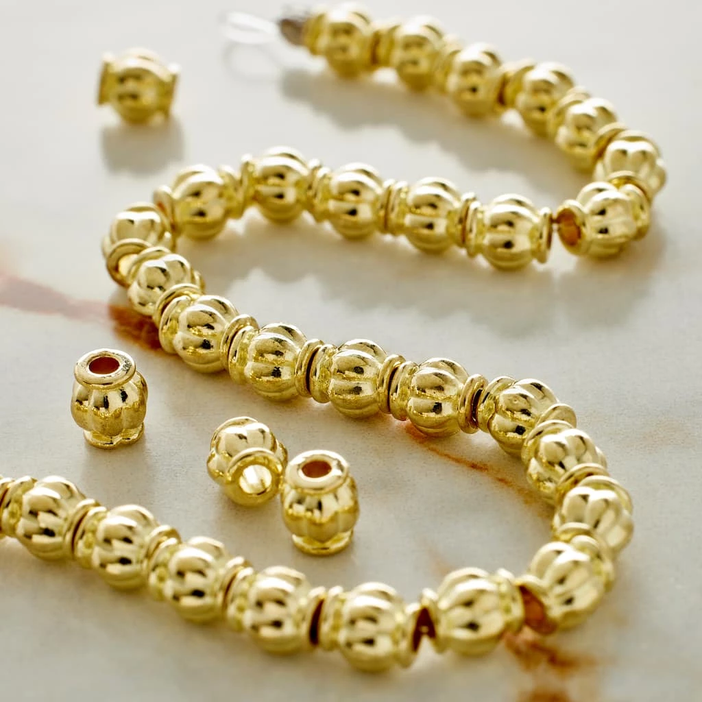 These metal lantern beads are shaped like a pumpkin and reflect light beautifully. They are ideal for creating earrings, necklaces, bracelets, and anklets.